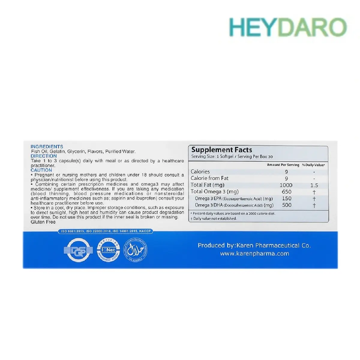 • سافت‌ژل امگا ۳ با دوز بالا، حاوی ۱۰۰۰ میلی‌گرم روغن ماهی شامل ۵۰۰ میلی‌گرم DHA و ۱۵۰ میلی‌گرم EPA